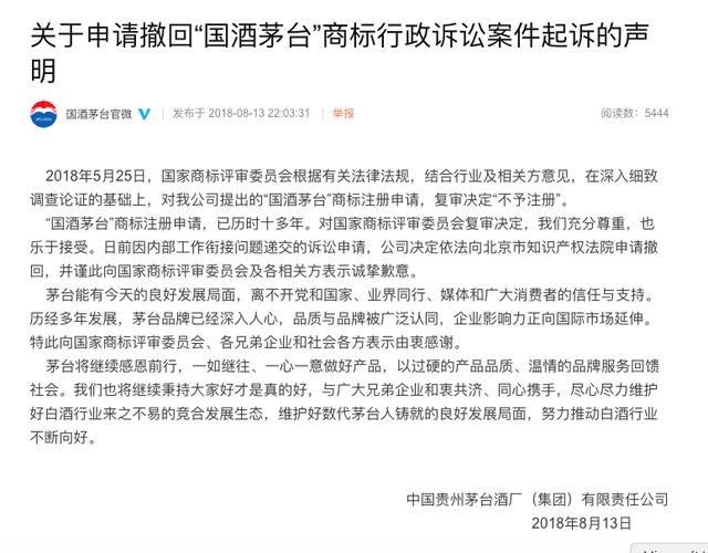 在8月13日晚这则声明中,茅台称,“对国家商标评审委员会复审决定,我们充分尊重,也乐于接受”。至于向北京知识产权法院提起的诉讼申请,茅台解释为“内部工作衔接问题”。