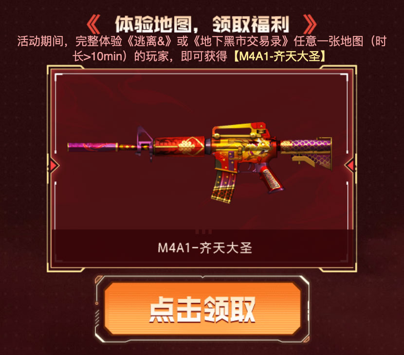 体验《逃离&》或《地下黑市交易录》任意一张地图(时长>10min)的玩家,领M4A1-齐天大圣