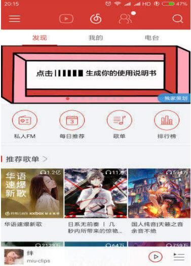 网易云音乐你的使用说明书玩法地址大家可以在网易云音乐手机客户端里找到。如下图所示,打开网易云音乐手机客户端就可以看到网易云音乐你的使用说明书在首页上端显示,点击即可开始生成独特网易云音乐你的使用说明书。