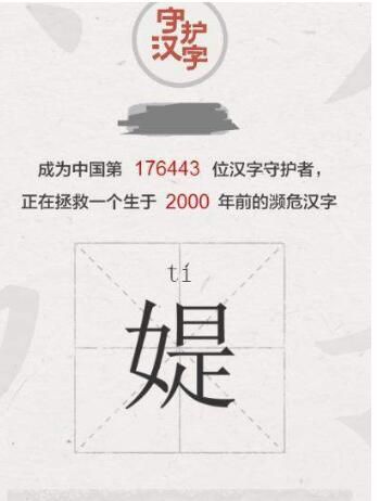 “你是哪个汉字的守护者?”很多人在朋友圈晒出了自己的新身份:汉字守护者。这其实是由人民日报客户端和网易有道词典共同推出的一款H5小游戏,输入自己的名字,就能匹配一个汉字,其中不少属于濒危汉字。