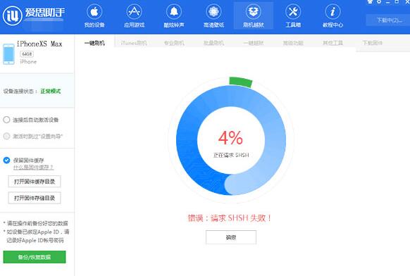 问题:iPhoneXS Max系统想刷机到iOS12.2正式版,用爱思助手开始刷机开始时都正常,当刷机进行到百分之四时提示请求SHSH失败,如图: