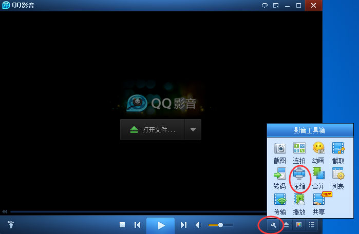 首先打开qq影音播放器;再在主界面的右下方找到“影音工具箱”,并打开里边的“压缩”工具;