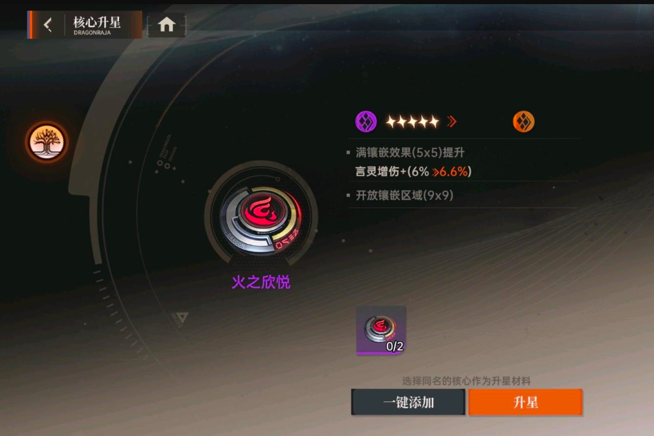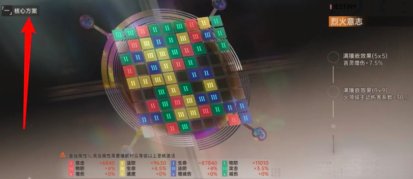 第三步:执行精准替换与扩容操作。当5×5圣核格全部嵌入有效圣核后,系统将自动触发升级流程,开放9×9圣核界面。此时需更换为更高阶的橙色圣核进行填充,推荐优先选用“火之你欣悦”“烈火意志”两类橙色圣核,其属性加成适配多数输出型英雄配置需求。虽支持“一键镶嵌”功能快速铺满当前格位,但为保障战力最大化,建议依据当前主力阵容特性,手动筛选匹配度更高的圣核类型进行部署。