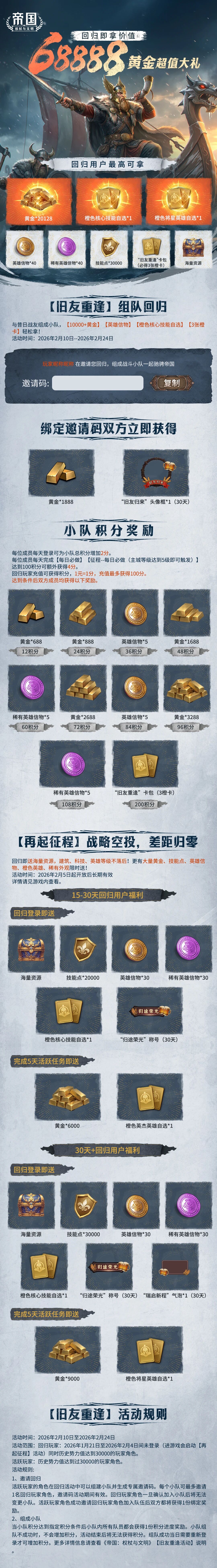 Tips:1.活动-再起征程:需满足活动开启前15日未登录游戏的条件,满足此条件的角色在进入游戏后会在游戏右上角轮播图中自动开启再起征程活动(再起征程中任务进度及未领取奖励可跨赛季保留进度)2.活动-旧友重逢:邀请方,需该角色历史势力值达到30000(历史势力值可在游戏中角色主页荣誉墙展示中进行查看)被邀请方,需满足参与活动-再起征程的条件并且参与活动的角色历史势力值达到30000