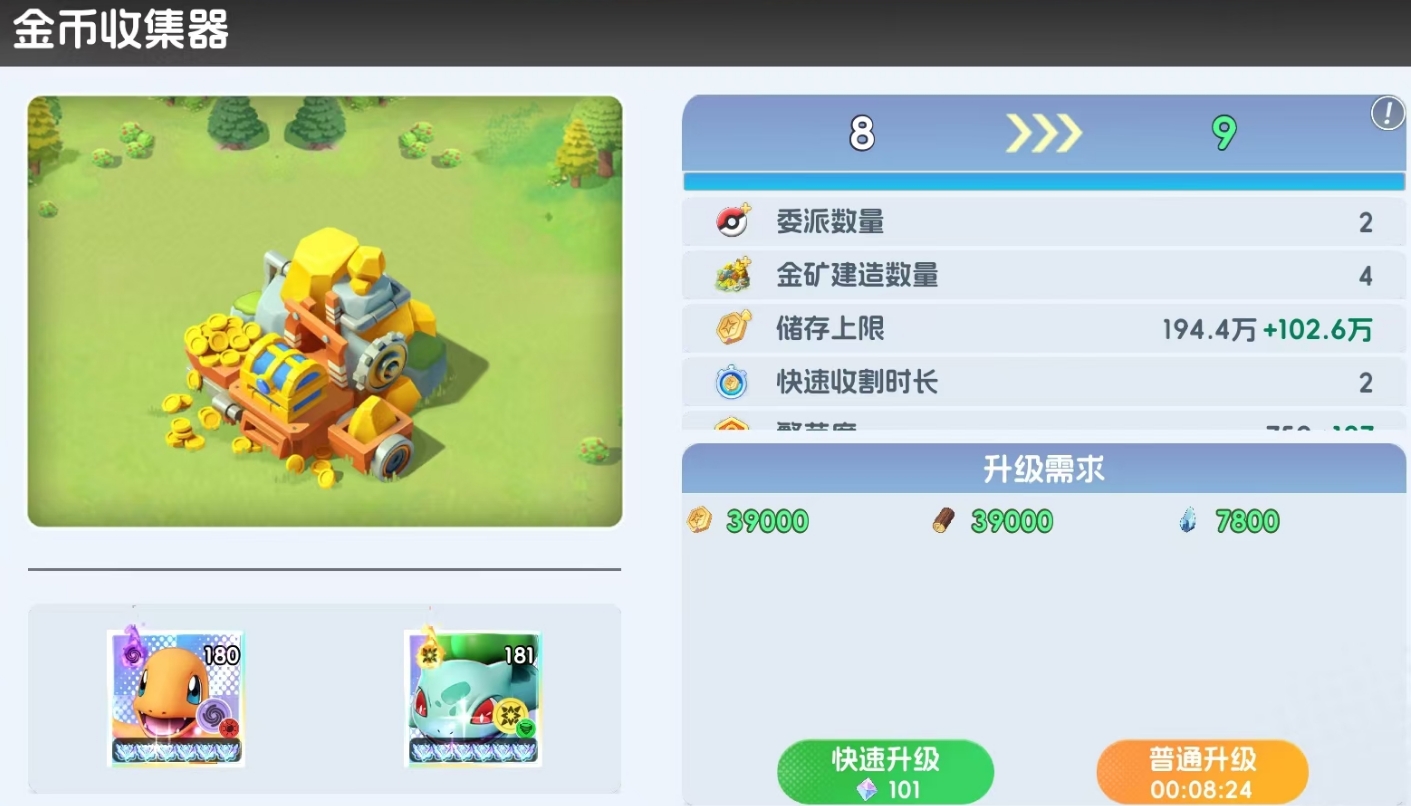 此外,金币收集器也属于可派遣宝可梦入驻的建筑,每只入驻金币收集器的宝可梦都可为该建筑提供增益,提高它的金币产量,星级越高的宝可梦所能带来的增益效果也越高,该效果不光能影响金矿正常产出的金币产量,就连金币收集器里的快速收割也能享受到这一方面的加成。升级后,还能解锁更多的派遣栏位,继续叠加此增益效果,最高能派遣三只宝可梦入驻(10级解锁)。