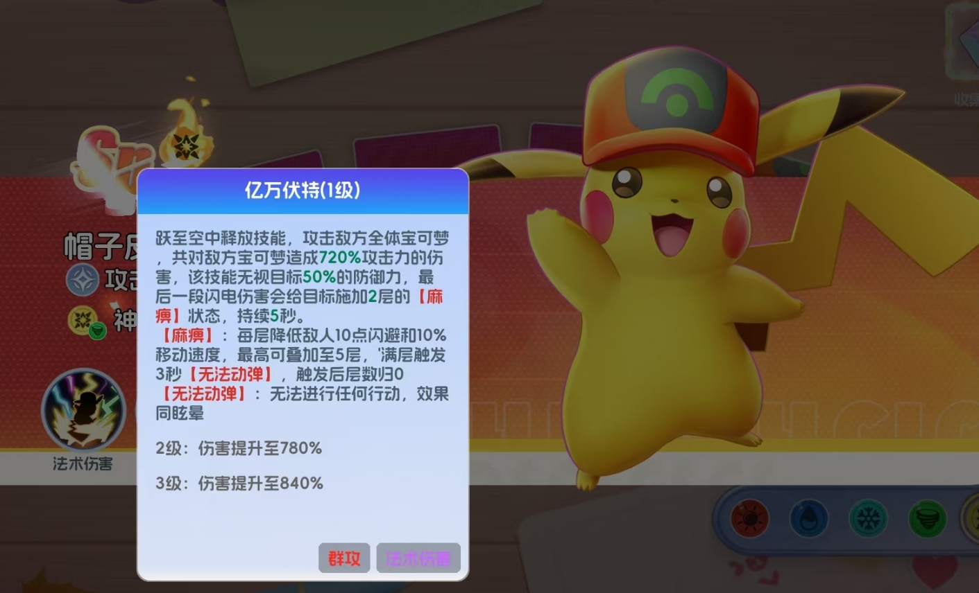 帽子皮卡丘是很依赖大招打伤害的宝可梦,一旦它完成怒气的积攒,就能跃至空中对敌方全体释放倍率超高的伤害,且该伤害不会因任何原因而衰减,不管是击中多名敌人还是只打到一名敌人身上,造成的伤害倍率都一样,所以也令帽子皮卡丘在对群和对单环境下都有极为亮眼的表现。最重要的是,这一大招还能无视敌人50%的防御力,在后期敌我双方防御都非常高时,这一效果所带来的优势会在战斗中表现得更为明显。