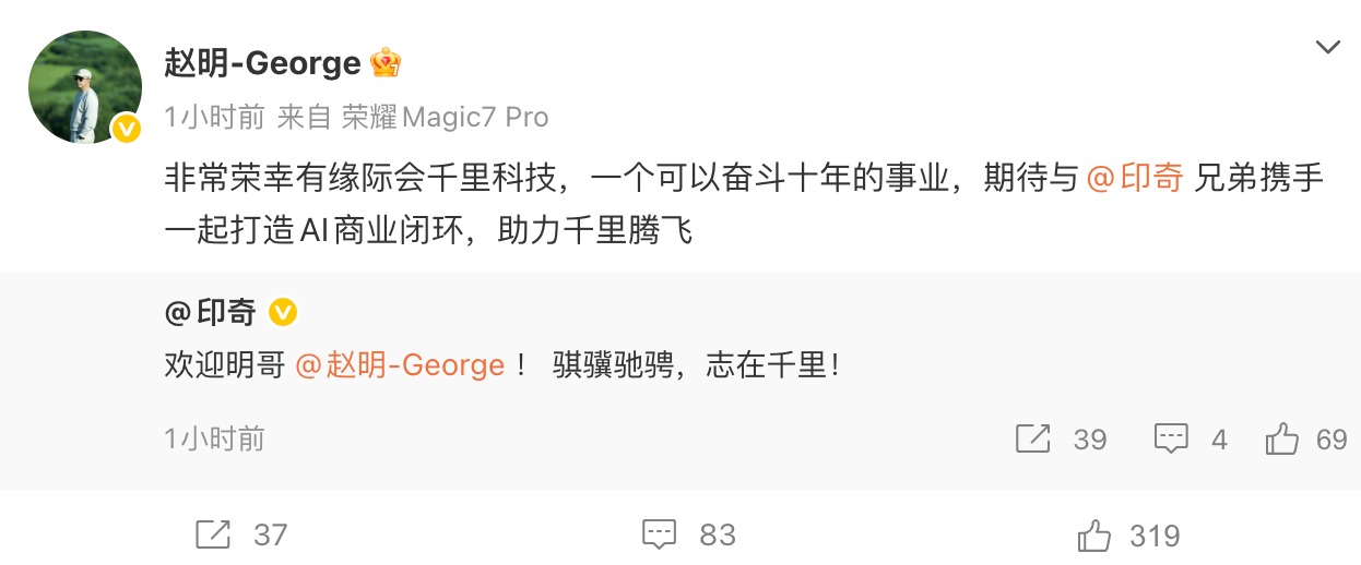 2月12日消息,原荣耀CEO赵明通过微博正式官宣加入千里科技,直言这是“一个可以奋斗十年的事业”,并表示期待与千里科技董事长印奇携手打造AI商业闭环,助力企业发展。对此,印奇也发文回应,以“骐骥驰骋,志在千里!”表达对赵明的欢迎。