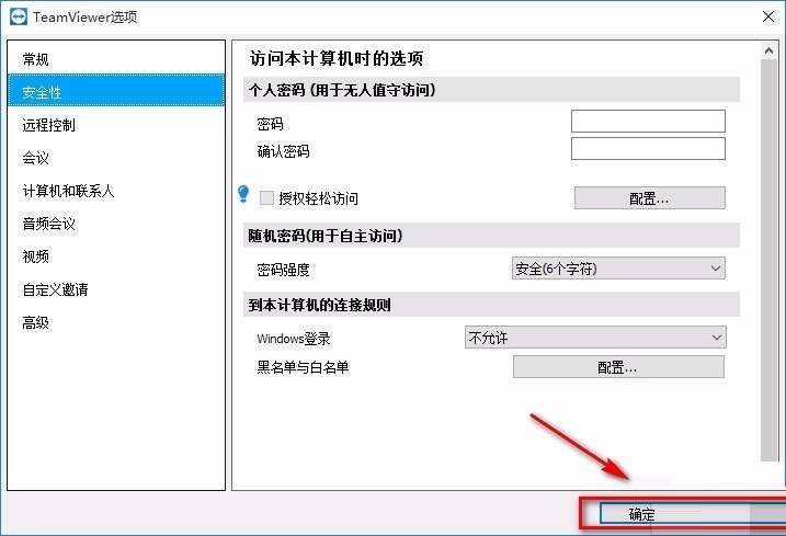 5.设置完毕后,将光标移至页面底部的“确定”按钮,点击以完成密码设置,使您的TeamViewer会话更加安全。