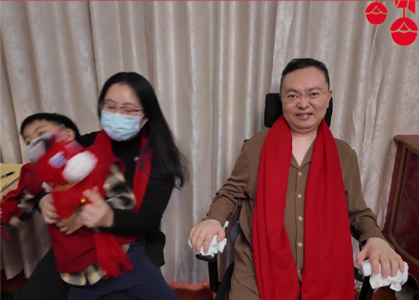 视频中,蔡磊戴着一条红围巾出镜,对着妻儿露出微笑。