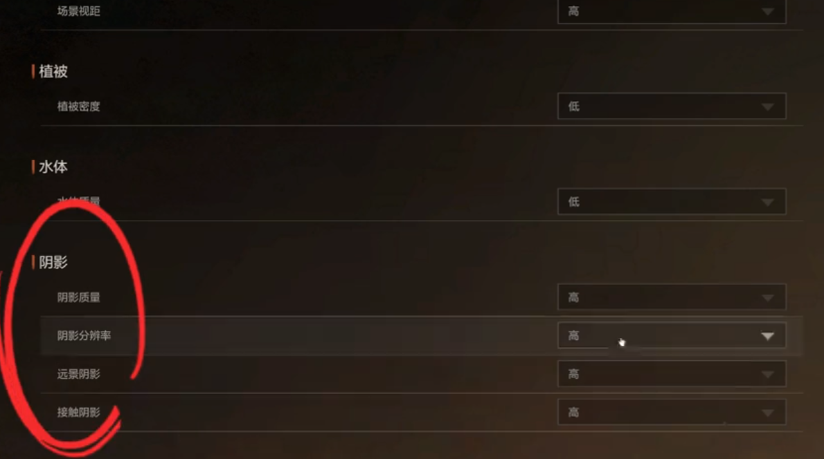 场景视距我们拉到“高”,能让我们更加的画面看的更远,敌人与物资的渲染距离也会更远,非常方便我们搜寻物资,提前发现敌人。植被密度直接调成低,毕竟谁也不想在大草原上走着走着,就被躲在草丛里的敌人阴掉,低植被密度也能更方便我们依靠地形差,打敌人一个猝不及防,要不然草坪的渲染太占视野了!阴影设置看似是小问题,但却非常影响我们的整体游戏流畅度,毕竟光阴渲染一直是很多游戏的噩梦。这里我们把阴影设置全调成最低,能极大幅度的解放我们的设备负载,有效缓解我们在大场景中的卡顿现象。