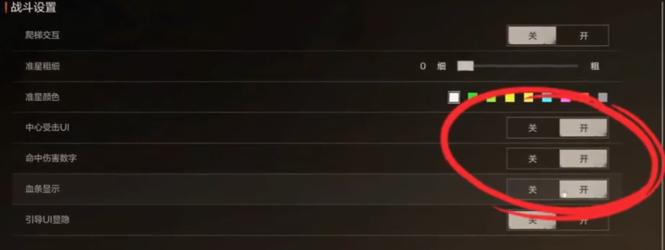 其次是我们的UI设置,我们点开游戏中的“UI”选项,能清楚的看见有好几个设置。我们把爬梯交互给关掉,要不然一靠近梯子就会自动触发攀爬,有时候会让我们错失良机,悔恨不已!相信很多小伙伴们也被许多游戏中的“自动攀爬”功能坑过吧!准星粗细和准星颜色根据自己的喜好设置来就可以了,小编这里推荐的话是准星颜色尽量选择高对比度的,比如红色粉色橙色之类的,与我们的自然环境做出区分就可以,千万别选绿色。“中心受击UI”和“命中伤害数字”,以及“血条显示”我们都打开,前两者能帮助我们更方便的判断是否击中敌人,对敌人造成了多少伤害以及对面穿的是什么套装,后者能帮助我们根据自己的血条来判断是否该突进还是撤退,毕竟我们在战斗的过程中,不可能一直盯着最下面的血条看。