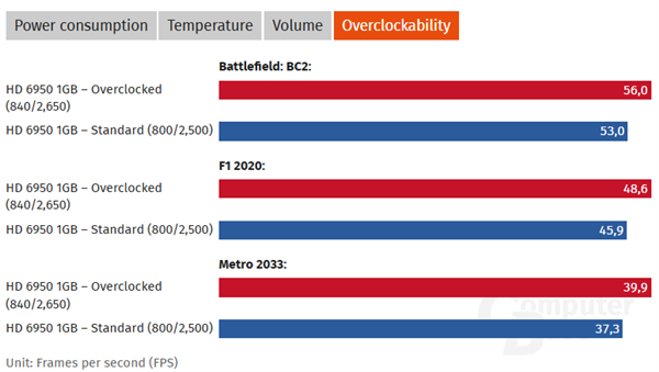 超频方面,核心频率可以达到840MHz,显存等效频率则能跑到5.3GHz,游戏帧率可以提高6%左右。