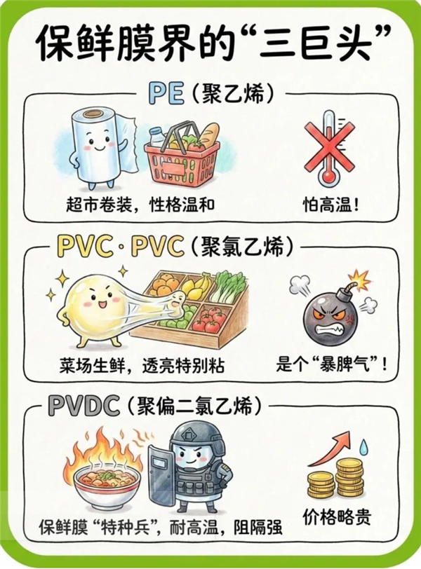 目前市面上常见的保鲜膜主要分为聚乙烯(PE)、聚氯乙烯(PVC)和聚偏二氯乙烯(PVDC)三种。