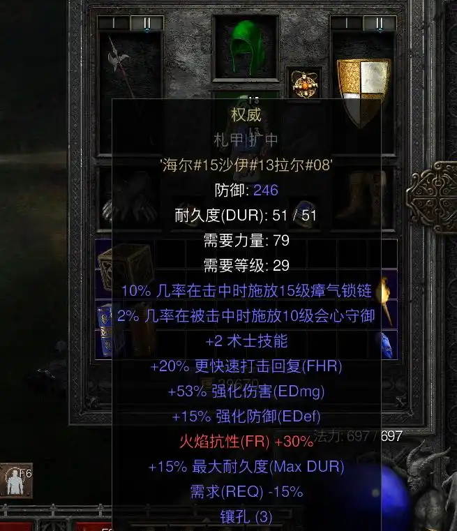 衣服:隐秘,2孔灰色衣服,符文顺序7号(塔尔)+5号(艾斯),或者暗金海蛇皮甲、天梯新增符文之语“权威”(3孔灰色衣服,15号海尔+13号沙伊+8号拉尔),大后期换成符文之语谜团。