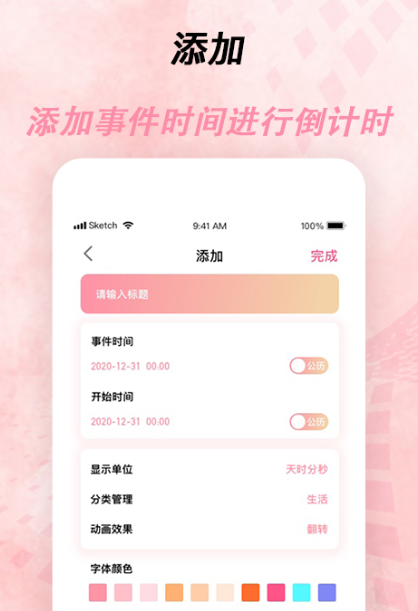 第四款应用程序将重点放在了极致的操控和纯时间上。弹出的页面上会出现已经建立的活动清单,按一下加号就可以迅速创建,只需要键入姓名和日期两个项目,整个过程不到5秒钟。预设的视图是按照剩下的日子来排列的,可以向左边滑动,也可以将重要的事情放在右边。这款软件从最简单的开始,适用于那些不想被多余功能困扰,只要基本倒计时的实用人士。