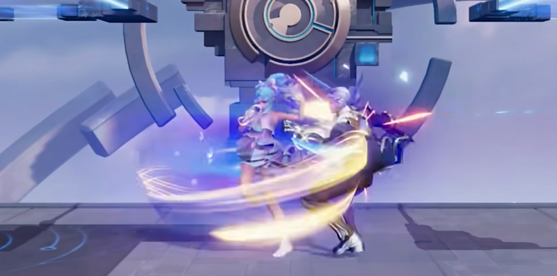 一技能音波涟漪,朵莉亚轻声唱歌,声波从自身向外扩散,敌人碰到声波受伤后还会以敌人为中心产生回响,形成刺激声波圈,在这个圈里,朵莉亚和队友都可以恢复一下状态。刺激声波要是接触到朵莉亚自己,会快速收缩,然后再对敌人造成一次伤害,也就是说一个一技能,最多能打出三段伤害,分别是声波扩散命中、回响产生,以及声波收缩这三次。不过声波扩散速度偏慢,敌人被命中也只是短暂硬直,不会被打飞,这点要提前有心理准备。也正因为一技能带回血功能,朵莉亚在2V2模式的价值,会更高,能持续帮队友补状态。