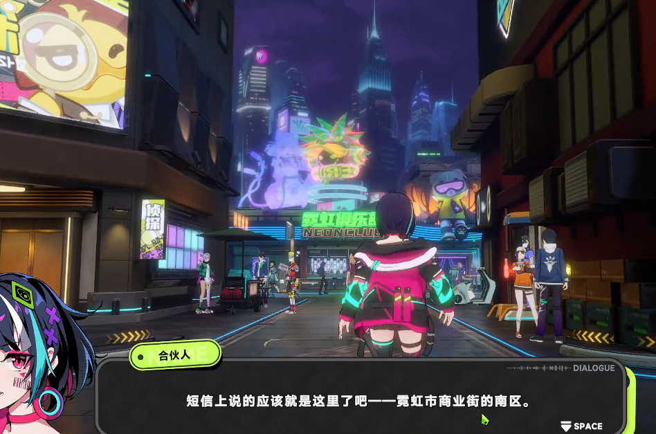 游戏主线不依赖强冲突或宏大设定,而是聚焦于细腻的人物关系与城市生态:玩家扮演一位继承多家产业的公司合伙人,在初入霓虹市时收到一条神秘讯息,由此开启探索之旅。首站即遇关键角色三日月——她不仅是引导玩家熟悉环境的向导,更是贯穿早期剧情的重要NPC,性格明快、观察敏锐,其对话自然带出主角背景与城市基本规则。