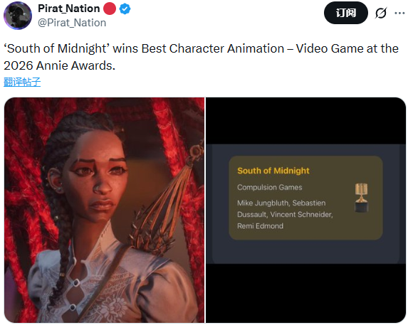 《午夜以南》早已发售,IGN评8分,M站均分77分,用户均分6.7分。近日该作获得了安妮奖最佳游戏角色动画奖,这在网上引发了热烈讨论。