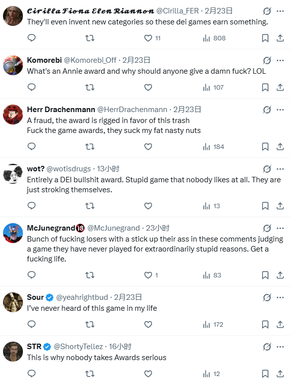 关于颁奖结果,玩家反响两级分化。有人表示:“这一定是黑幕”“安妮奖是啥?有人在意这个么”“荒谬的DEI奖,这游戏无聊透顶,没人喜欢。他们只是在自吹自擂罢了”,但也有人表示:“该作角色动画效果很棒,实至名归。”