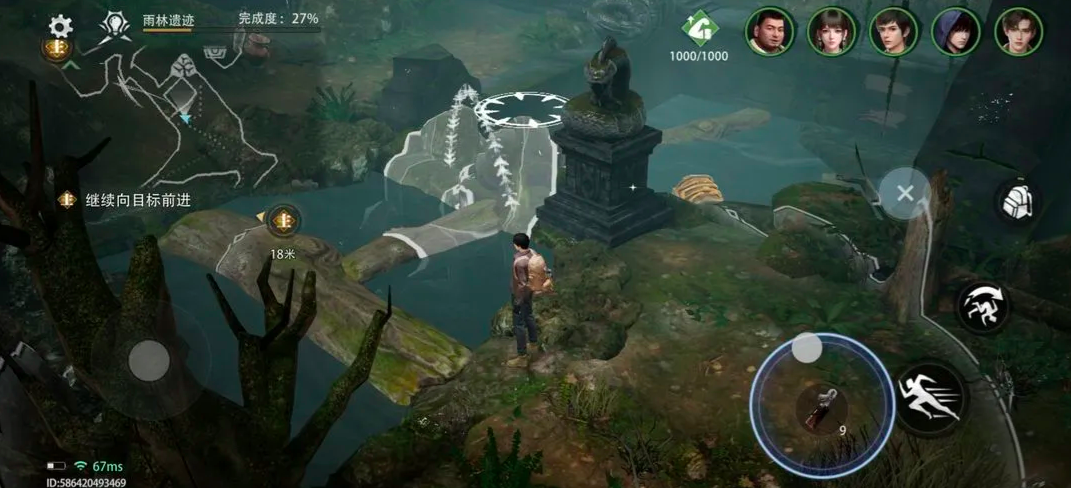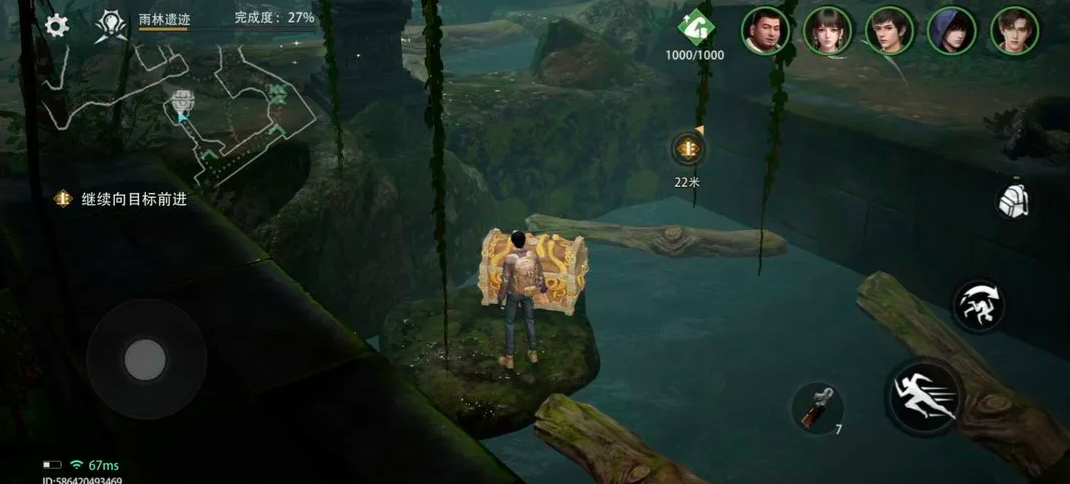 这个任务位于西王母国的雨林遗迹当中,玩家可以先将自己传送至雨林遗迹章节,跟随引导前往林地。在此处可以看到几个有石头搭建而成的桥梁,如小编在下图所展示,此时建议玩家带上吴邪并解锁罗盘装置,吴邪这一角色的解谜性能更佳,可以说是专业的解谜担当,而且解锁罗盘道具后,可以让吴邪解谜的成功率在提升20%,玩家穿过小河,然后跳跃过两座山石之间,就能够看到隐藏在山石后,水面上的漂浮宝藏箱。