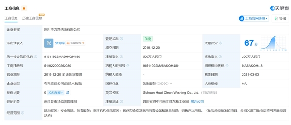 通过公开资料查询发现,四川华力净洗涤有限公司成立于2019年12月,法定代表人为张琼华。