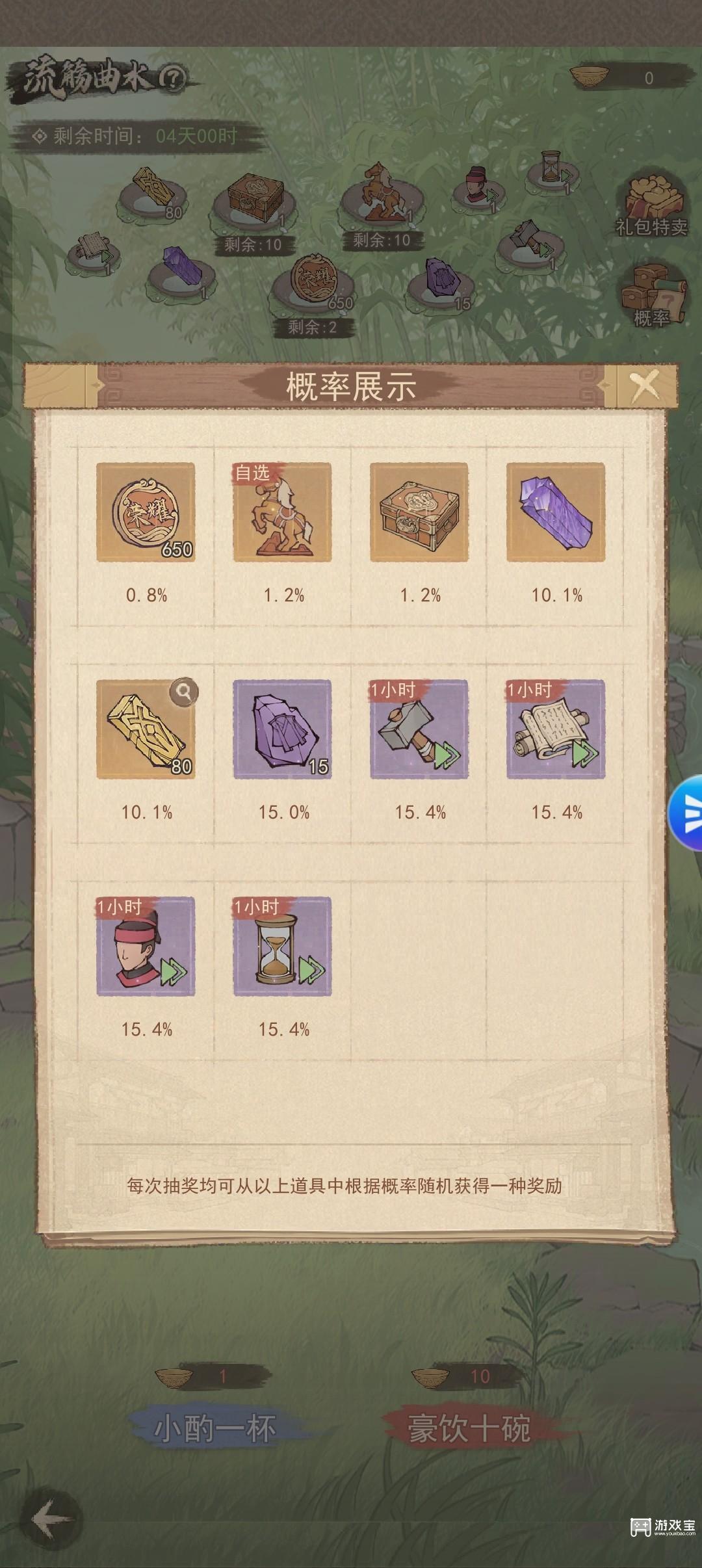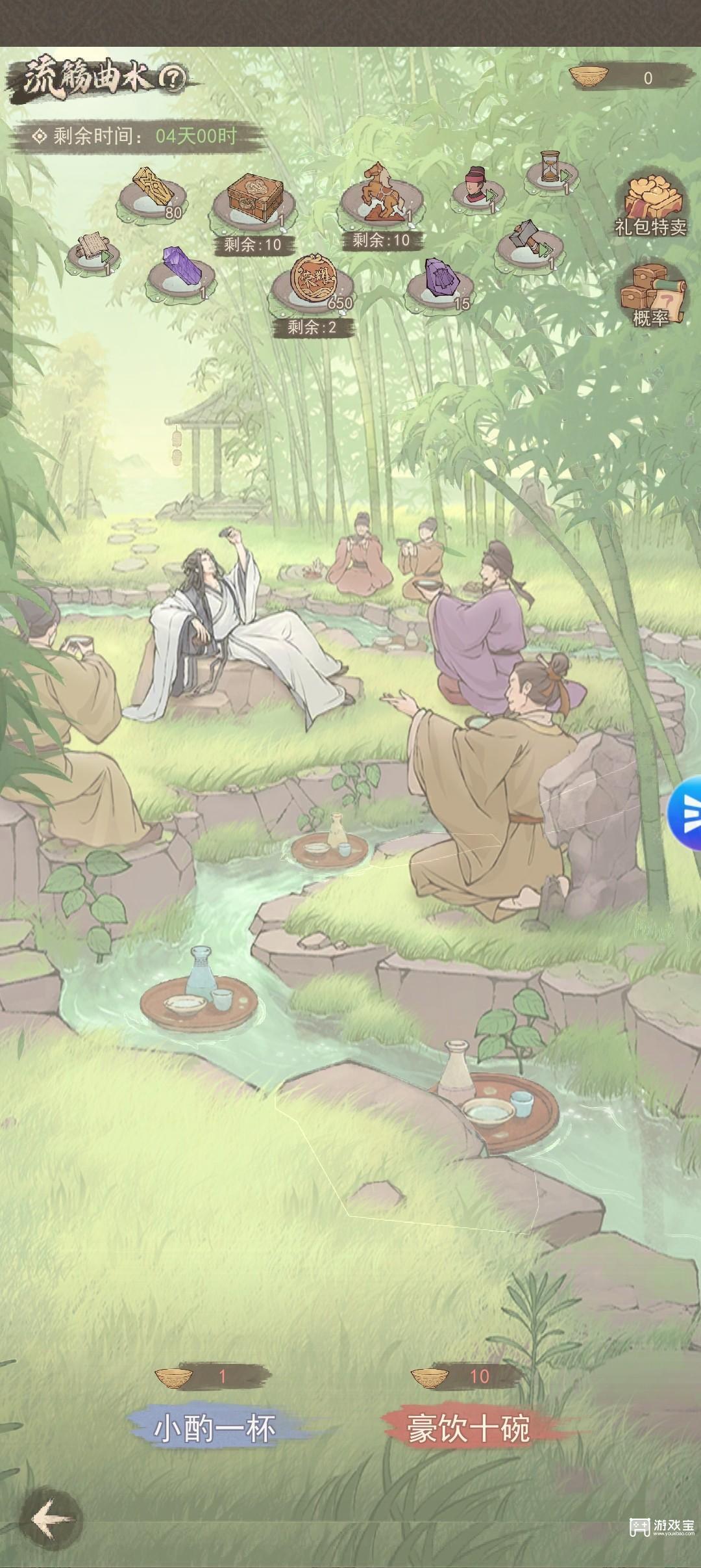 流觞曲水为周期性活动,每两个月开启一次,活动时长7天,核心玩法就是消耗曲水金觞(简称金碗)参与抽奖,所有奖励都靠金碗抽取获取,具体获取方式分两类: