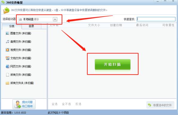 进入到文件恢复界面后,在右上方选择需要进行扫描的位置,接着点击中间的“开始扫描”就可以了。扫描完成后,按照步骤恢复即可。