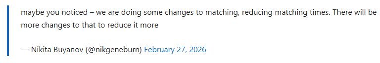 好评搜打撤名作《逃离塔科夫》其中一项游戏问题备受诟病,就是玩家队伍的匹配时间过长,不过昨天有大批玩家惊喜的发现匹配时间变快了,开发商Battlestate Games工作室负责人Nikita Buyanov回应称,的确是进行了游戏系统改良,从此告别缓慢匹配的游戏称号。