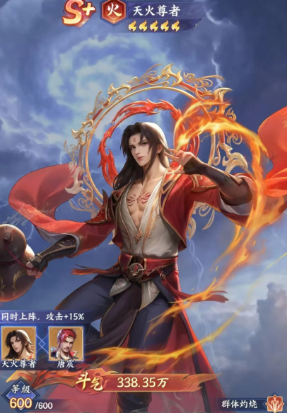 天火尊者目前作为一个品质最高等级的斗者卡牌,他的场内价值绝对是非常高的,所以也是值得培养当中的一员,作为一个火属性的角色,目前天火尊者他拥有的羁绊效果是在跟唐震这个角色一同上场的时候可以带来的,一般情况下他俩同时上场带来的攻击百分比会有15%的提升,而且全都获得这样的攻击加成之后,其中的普攻也会带来一个群体锁定的效果,覆盖到的单位是敌方的前排角色,那么在有这样伤害的时候,我方也可以提升整体的压制效果,特别是在当前的玩法当中大家也要注意他的技能当中利用空间绞杀这个技能,是可以针对敌方全体敌人都造成一部分伤害的,伤害成功之后他这里基础虽然只有70%的伤害数值是比较低,但是会有40%的概率可以施加燃烧的效果,后期每一个燃烧效果会在每个回合里面扣除目标身上30%的生命数值,这个生命数值是根据施法者攻击数值提取的30%数值来进行扣除,而且也会无视对面身上的防御属性,所以这个机制大家要用起来的话,一般是把天火尊者作为主控来使用。