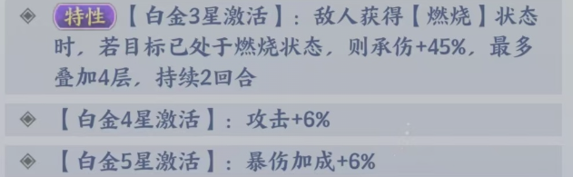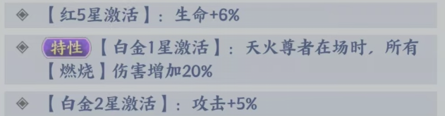 而在白金三星的时候,他激活的能力当中,大家也可以看到只要敌人获得了燃烧状态,那么这个目标处于燃烧失效状态当中的话,他在攻击敌人的时候,会带来一个增加45%的数值的承伤,而且还可以叠加,叠加到四层的时候,在这里天火尊者带来的整体承伤数值都会高很多,所以目前天火尊者他在提升空间上面,还是有很多的能力,大家可以进行触发的后期如果想要为他搭配一个灼烧流派的话,那么这里阵容当中,大家还可以给天火尊者搭配唐真,邙天尺、风尊者、玄空子。