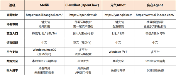 从部署难度来看,Clawdbot(OpenClaw)部署环境复杂,需要一定技术基础;元气AIBot虽一键安装,但配置极简且主要聚焦Windows平台;实在Agent社区版易部署,企业版支持私有化,但仅社区版免费。