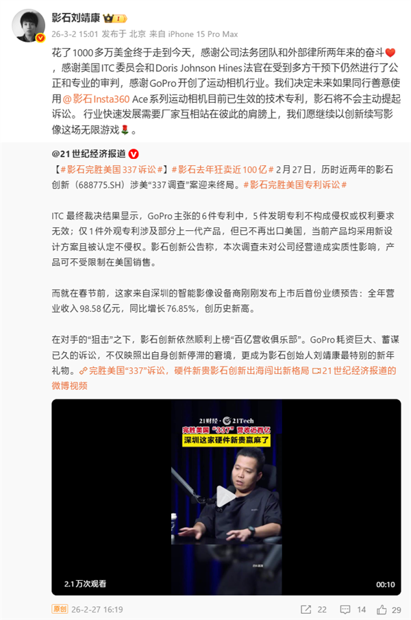 3月2日消息,影石Insta360创始人兼CEO刘靖康就公司完胜与GoPro的美国337调查诉讼作出公开回应: