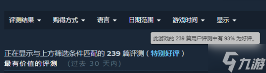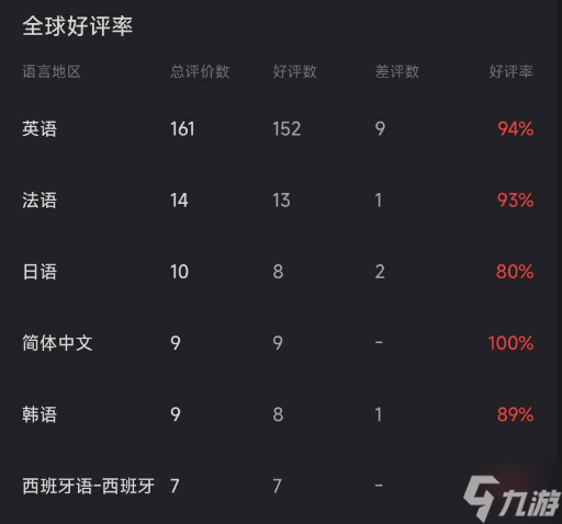 在现有的239条评价中,好评率高达93%。其中英语地区占总评数大头,总计161条评价,好评率高达94%。简中地区排第四,虽然只有9条评价,但好评率来到了100%。