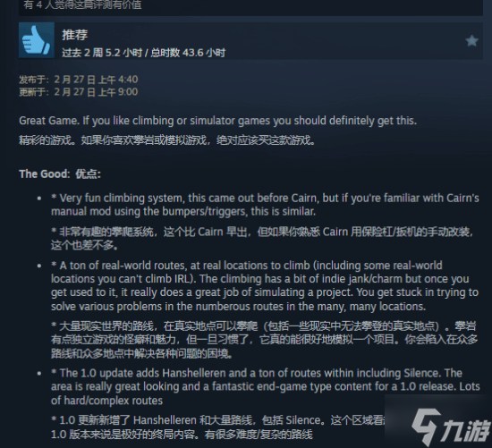 不少玩家认为本作非常拟真,很好地还原了攀岩体验。不过,即使正式版已经发售,游戏仍略显粗糙,后续还需要继续打磨。