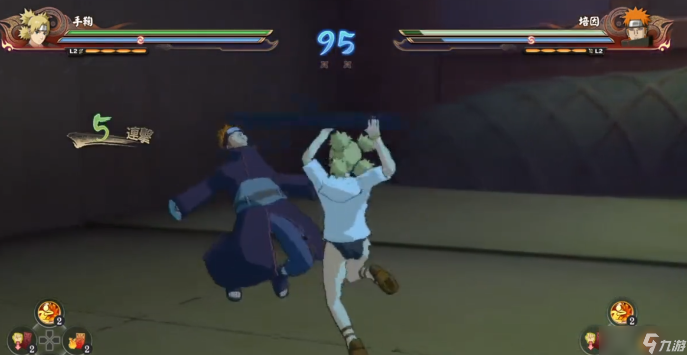 手鞠的第一段攻击向前肘击,2A用扇子向前挥打,3A转身再打一下,4A向前连踢两脚,5A张开扇子向下挥砍。5A命中敌人会使敌方跪地,是手鞠固定的衔接点。这五段平A就是少年手鞠的所有前置攻击,没有命中敌人时,中下段攻击只能打到第5A ,上段攻击可以原地打满。中段攻第6A挥舞扇子打出风弹,击中敌人直接造成大僵直。第7A反手再来一下,第8A进入特写将敌方击飞。下段攻击第6A用扇子向下打出风弹,7A同样是反手再扇一下,8A进特写将敌方击倒。