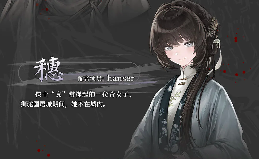 一提到“穗”,不得不提的一位就是“良”,良是狮驼国当中有名的侠士,穗则是两口中常被提起的一名奇女子,在狮驼国屠城期间,穗刚好不在城内,而通过这一提示的话,小编推测穗很有可能在游戏中的大结局里存活下来,不过该游戏是双线叙事模式,而且采用多分支矩形走向,所以该角色最终的结局,也与玩家们的选择方向有着非常大的关联,在游戏当中穗这一角色可以说是非常重要的引导型角色,通过她的口中讲述了很多关于狮驼国的故事,还有各种民间的奇闻异事,为玩家们提供不少解谜线索。