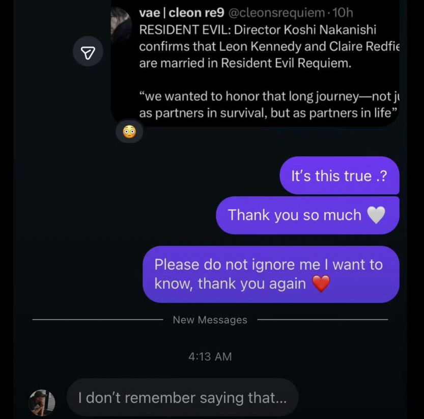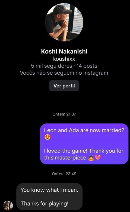 近日,有玩家在Instagram上向本作制作人中西晃史提问,询问里昂是否与艾达·王结婚。该玩家表示:“里昂和艾达现在结婚了吗?我爱这个游戏!谢谢你创作了这部杰作。”对此,中西晃史回应称:“你懂我的意思。”相关表态被部分玩家解读为一种开放式回答。