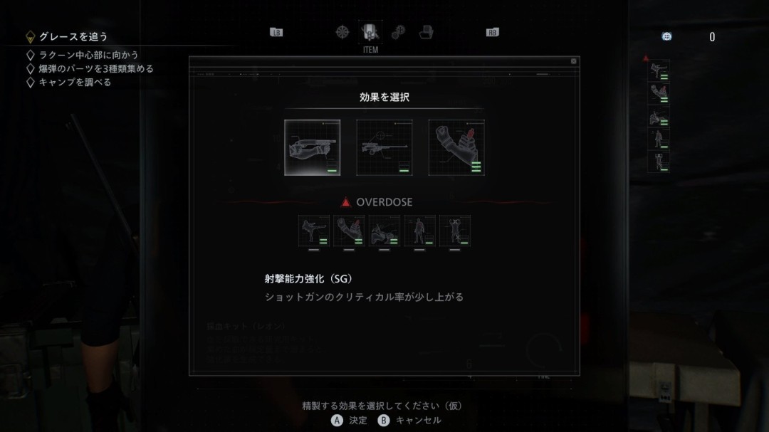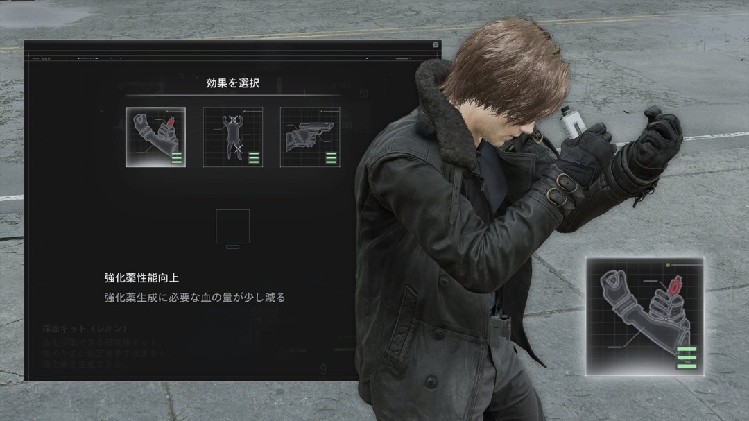 根据发掘的信息来看,似乎里昂在早期与格蕾丝一样拥有能够强化能力的注射器。其中包含三向升级,第一项为减少生成强化药时所需的血量,其他两项据猜测是增加肢体破坏的伤害以及射击稳定性。而在第二章里昂重回浣熊市寻找格蕾丝时,将拥有更多的升级。