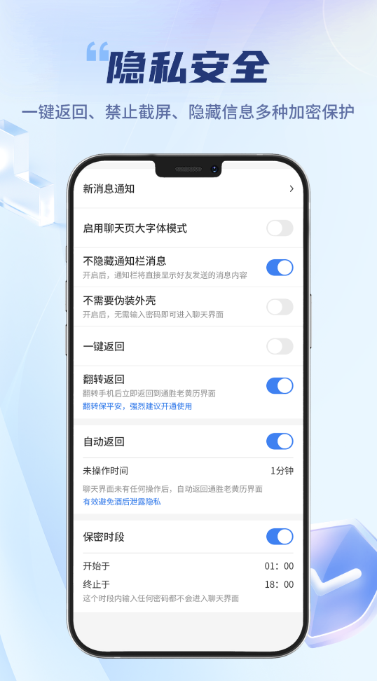 面向高信任度关系用户的“隐形通讯”方案,提供多重伪装能力:可将应用图标、名称、启动入口模拟为计算器、备忘录等常见工具类APP;聊天记录支持定时自动销毁或手动一键清空,语音、图片、文件均不留本地痕迹;进入密聊空间必须通过独立验证方式,杜绝误触与非授权访问。