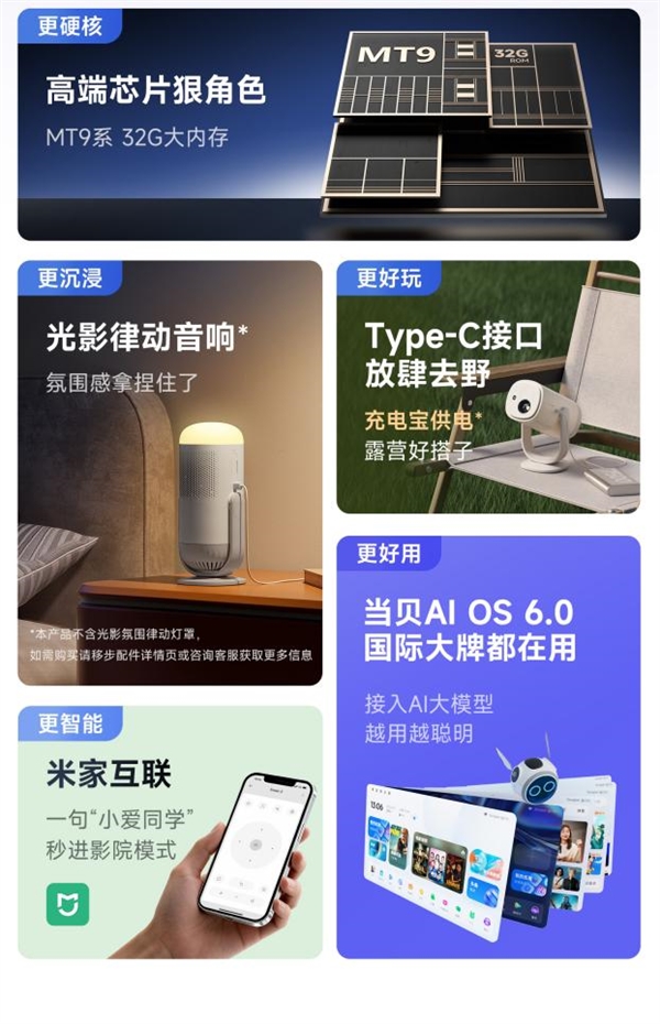 系统流畅度和实用性,同样是便携投影仪推荐当贝Smart2的重要支撑。它搭载MT9系列四核处理器+32GB存储,安装APP、播放4K视频都流畅不卡顿,还支持MEMC 120Hz运动补偿,看球赛、动作片无拖影。搭载当贝AI OS 6.0,开机无广告,操作简洁,接入AI大模型,语音控制响应迅速,使用体验拉满。
