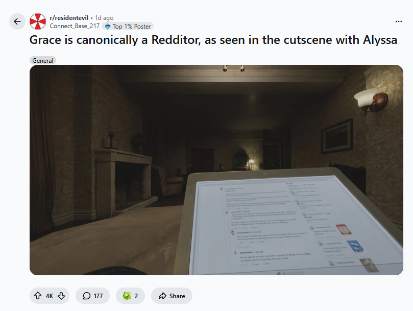 近日,玩家在《生化危机9:安魂曲》中发现一处隐藏细节。在游戏的闪回场景中,角色格蕾丝·阿什克罗夫特使用笔记本电脑的画面里,开发者设置了只有在探索边界外区域才能看到的Reddit网页界面。