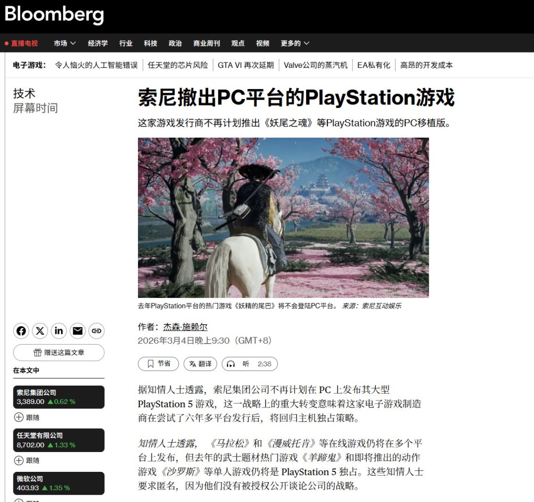 索尼第一方游戏放弃移植PC,可能的原因是销量不佳,因为这些游戏起码是在半年-1年之后才登陆PC,而且失去独占也会给PlayStation品牌造成伤害。