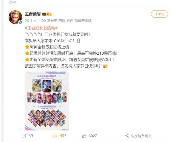 3月4日,记者从《王者荣耀》官方账号获悉,《王者荣耀》正式开启妇女节系列活动,为玩家带来多重福利。