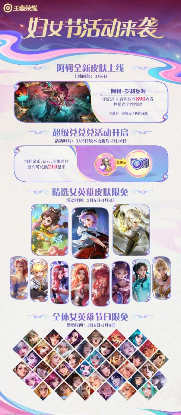 结语:以上是号令cc的小编为你收集的王者荣耀官宣妇女节活动:全体女英雄节日限免,多款精选女英雄皮肤限免,希望有帮到小伙伴们,更多相关的文章请关注本站。