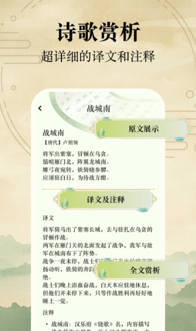 支持iOS与Android双平台无缝使用,界面简洁无冗余信息干扰。平台汇聚超十万首历代诗词,严格按朝代、作者、体裁进行结构化归档,检索响应迅速;每首诗均配备权威注释与白话译文,帮助用户穿透语言隔阂;内置飞花令、接龙挑战等互动模块,强化记忆与趣味性;独创屏幕临摹功能,结合书法练习与诗句赏析,实现读、写、思一体化学习闭环,全面提升古典文学素养。