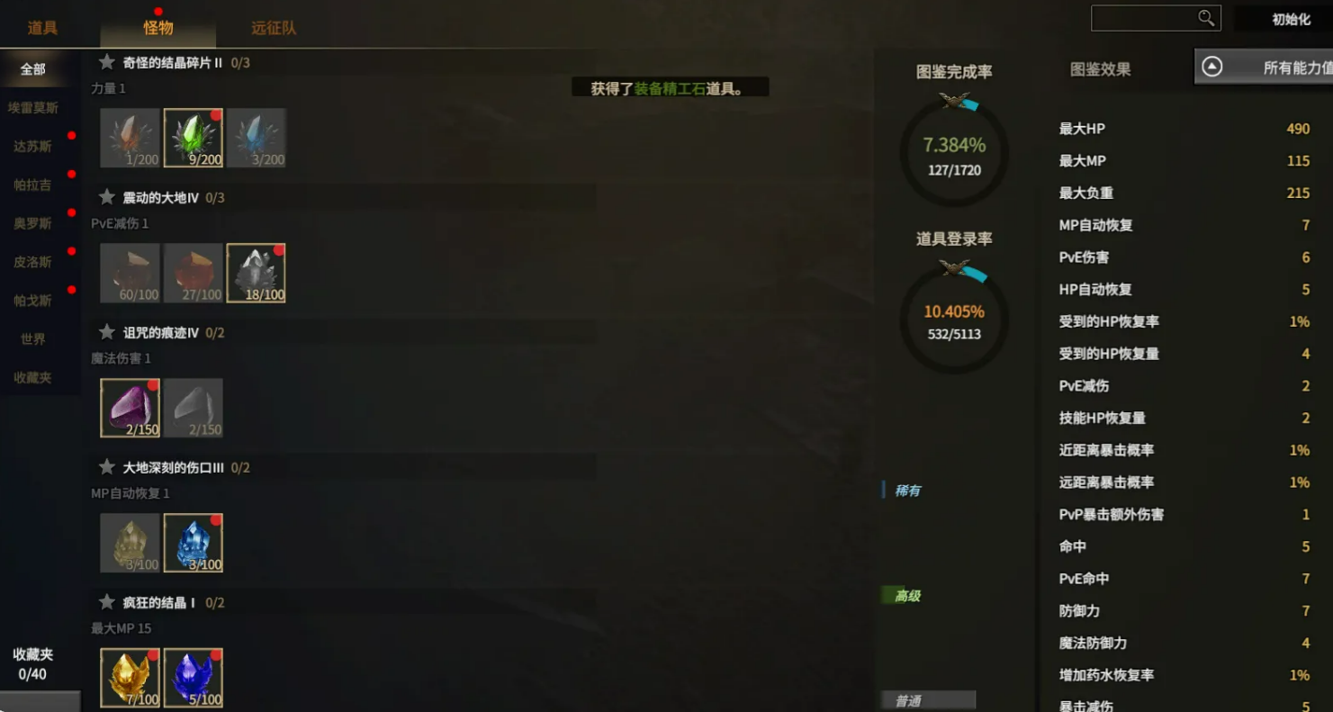 怪物图鉴专注记录各大陆野外怪物掉落的玉石类材料。其解锁路径具备灵活性:第一,常规击杀野外怪物随机获取;第二,通过交易所直接购入对应玉石;第三,使用原石碎片在制作系统中合成等效替代品完成解锁。三种方式可依个人资源状况动态选择——若金币与时间充裕,交易所采购能显著缩短收集周期;若偏好资源自给,则可通过持续刷怪积累原石碎片逐步合成。