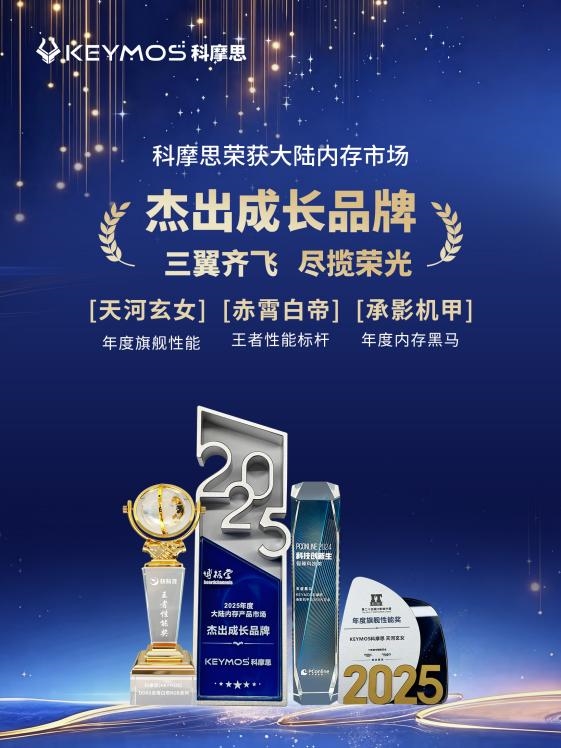 消费类模组推出承影机甲、赤霄白帝和天河玄女等3个系列产品,其赤霄白帝以C26的超低时序重新树立DDR5内存条时序新标杆,荣获年度王者性能奖项。凭借着海力士A-die的优势资源,科摩思模组产品线在2025年成功跻身大陆内存市场出货量前五,这一突破性成果,标志着科摩思这个新锐品牌逐渐在市场中站稳脚跟。