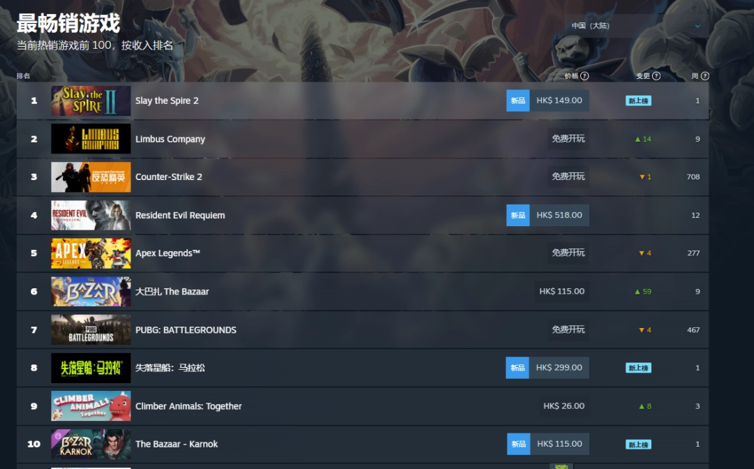 根据平台数据,《杀戮尖塔2》上线后迅速登顶Steam 全球&国区热销榜榜,超越了《生化危机9》,相比之下,另一款备受关注的射击游戏《马拉松》在线人数则明显逊色。