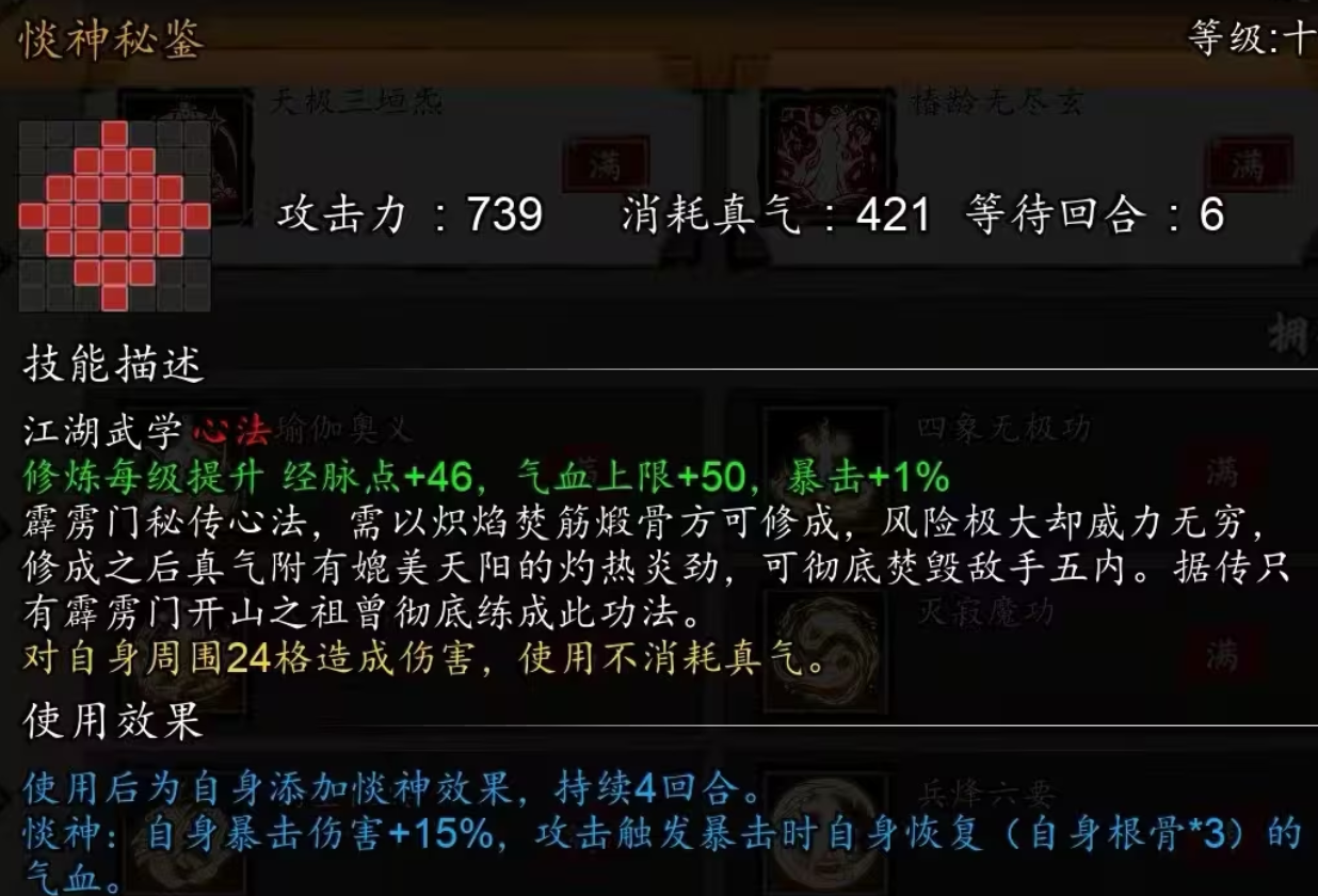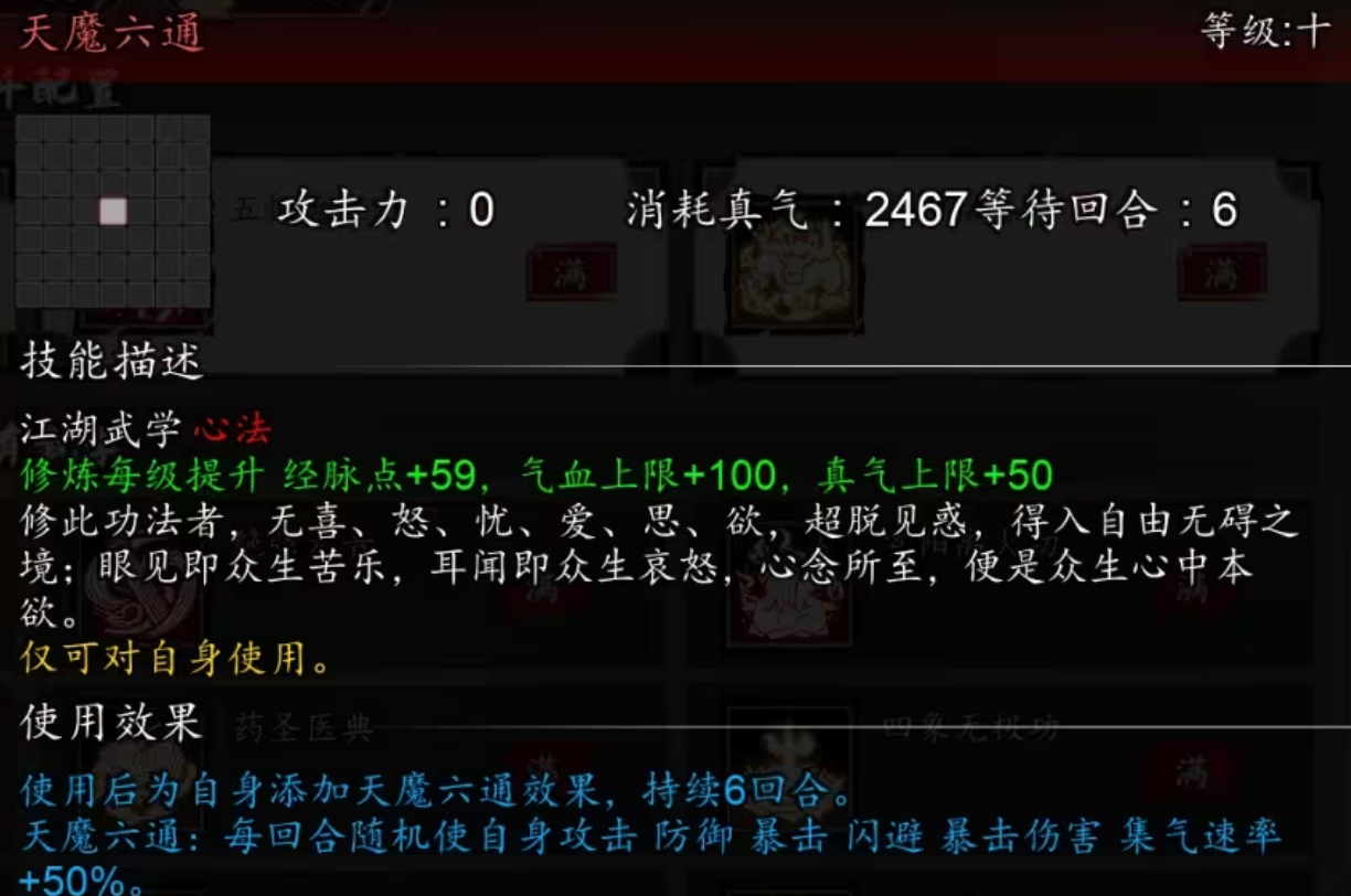 就心法来说,天魔六通同惔神秘鉴、五恒天经相配,几乎不可能有其他合适的搭配。惔神秘鉴的特殊之处在于暴击之后会降低心法冷却时间,和多段技能配合效果很好,使技能循环几乎无限延长。加上五恒天经的辅助后,在游戏里可以同时输出高额生命值和操作灵活度,可以应付复杂的环境。经由心法的配合,整套组合的爆发和续航完美融合在一起,为后面招式的衔接打下了基础。