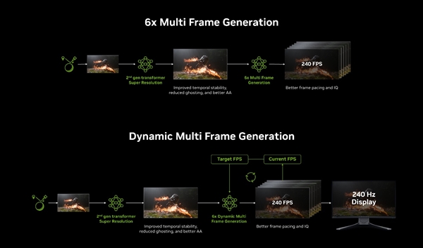 GeForce RTX 40 系列用户还可以开启DLSS帧生成来提升性能,而 GeForce RTX 50 系列用户可以开启DLSS4 多帧生成,与启用DLSS光线重建和DLSS超分辨率时的性能相比,帧率最高可提升至原来的 3 倍。在不久后,DLSS 4.5的6倍多帧生成和动态多帧生成技术也将正式跟玩家见面。